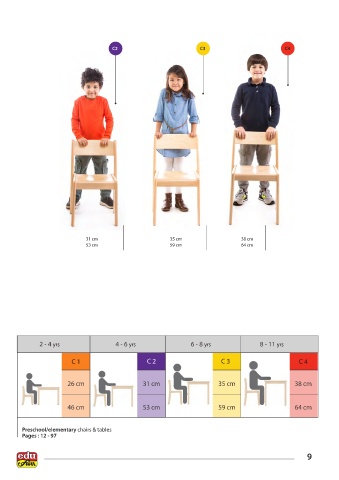 C2 C3 C4 31 cm 35 cm 38 cm 53 cm 59 cm 64 cm 2 - 4 yrs 4 - 6 yrs 6 - 8 yrs 8 - 11 yrs C 1 C 2 C 3 C 4 26 cm 31 cm 35 cm 38 cm 46 cm 53 cm 59 cm 64 cm Preschool/elementary chairs & tables Pages : 12 - 97 9